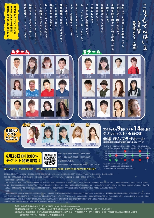 株式会社エンターアーツプロモーション/株式会社にゃんにゃんカムカム/株式会社ワタナベエンターテインメント主催、『こりゃもてんばい2』が2022年8月9日 (火) ~2022年8月14日 (日)にぽんプラザホール(福岡県福岡市 博多区祇園町8番3号)にて上演されます。