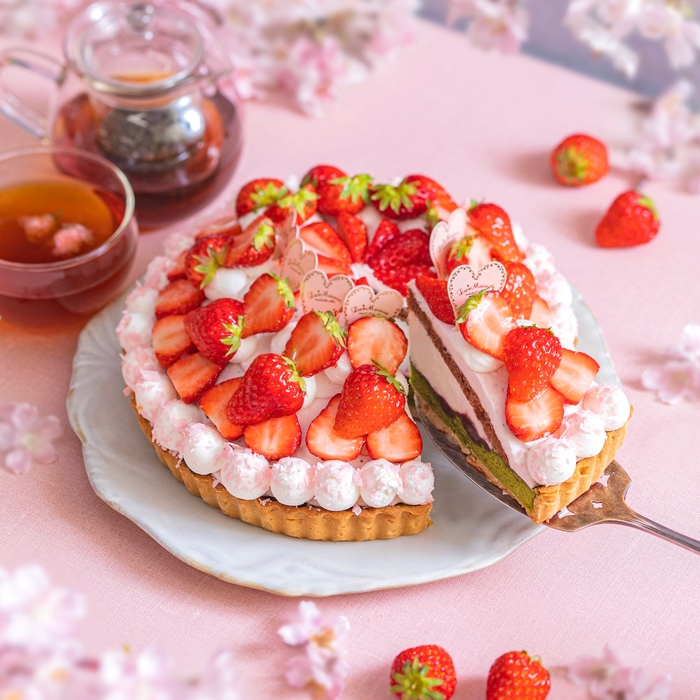 大納言あずき入りの抹茶ケークタルトにグリオットチェリージャムをしのばせ、さくらのクリームを重ねました。甘酸っぱい紅ほっぺとさくらの風味を合わせた和テイストタルトです。