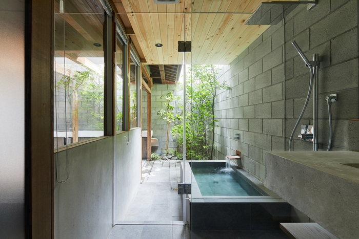 床を掘り込んだリビングは人が集まり語らう場に、離れの浴室には庭を眺めながら入れる檜風呂、それぞれの場所にある景色移り変わる景色を奏でる宿。