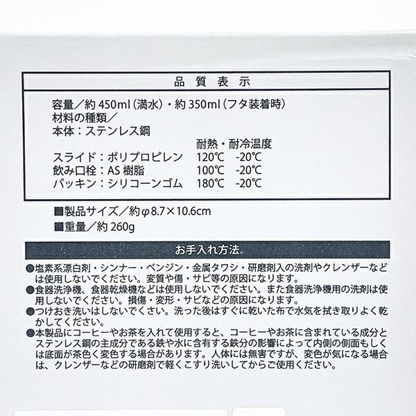 サイズは8.7cm×8.7cm×10.6cm 350ml入るたっぷりサイズ。保冷保温に優れているので長い時間飲み物を楽しむことができます。