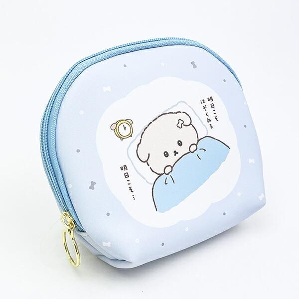 こちらはいしよわちゃんのポーチです。淡いブルーがいしよわちゃんによく映えます。「明日のじぶんにまかせます」のメッセージは今日の自分にとってやさしい言い訳になっています。弱さも愛しく感じるキャラクターですね。