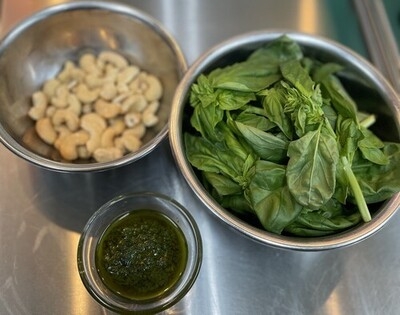 さらに、スイートバジルをふんだんに使い、カシューナッツ、胡麻油で作ったオリジナルソースをかけて完成です。
