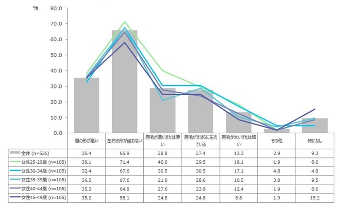 『左右の形が揃わない(65.9%)』という回答が最も多く、次いで『眉の形が悪い(35.4%)』『眉毛は濃いまたは薄い(28.8%)』と続きました。雑誌やSNSなどで「眉の描き方・整え方」の情報は溢れていますが、実際毛流れや表情筋の付き方は人それぞれ。その結果、解決方法が見つからず悩み続ける女性が多いのかもしれません。