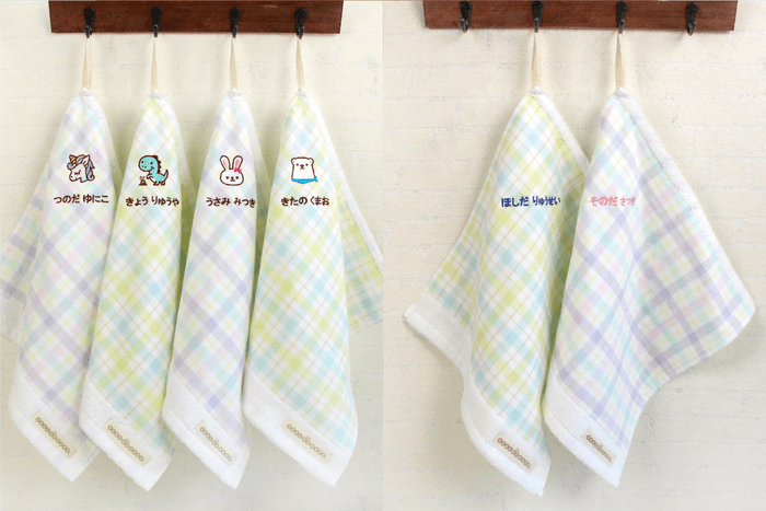 文字の読めない年齢のお子さまが使用しても、自分のものと認識しやすくなるようにイラスト刺繍を大きめに入れています。イラストの入らないお名前のみは、タオルの色に合わせて約600種類の色からデザイナーが厳選した色となっています。
