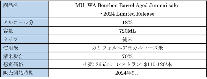 2024年9月に高付加価値タイプの新ブランドとして新発売した「MU|WA※1」は、純米酒をバーボン樽で貯蔵した新しいタイプの熟成SAKEで、米国産バーボンの風味と米国産純米酒のハーモニーが楽しめます。純米酒ならでは旨みやコクに加え、バーボン樽由来のスパイシーな香りと果実味が溶け込んだ味わいが特徴です。肉料理やチーズ、シーフードなど幅広い料理との相性が良く、日本食レストランのみならず、フュージョン料理店など様々なレストランでの販売を強化します。