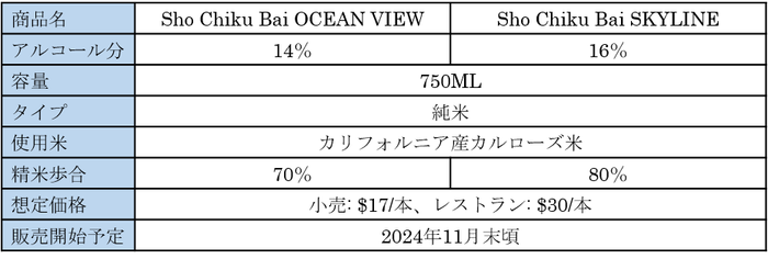 11月に新発売する「Sho Chiku Bai OCEAN VIEW※2」「Sho Chiku Bai SKYLINE※2」は、ワインユーザーをターゲットに、米国の魚料理や肉料理とのマリアージュを楽しんでいただくための、高酸度の酒質が特徴の新しい普及タイプのSAKEで、ワインと清酒の架け橋となる純米酒を目指して開発しました。「OCEAN VIEW」は、爽やかな酸味が特徴で、牡蠣などのシーフードとのマリアージュが楽しめ、「SKYLINE」は、深みとコクのある味わいが特徴で、肉料理との相性が抜群です。