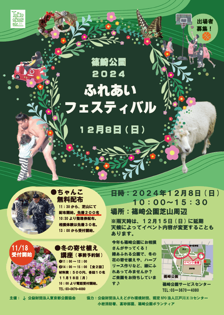 今年も篠崎公園にお相撲さんがやってきます!本物のお相撲さんと、一緒にお相撲をとってみませんか。その他にも、ちゃんこの無料配布、3×3ストリートバスケット大会開催、ふれあい動物園、冬の花の寄せ植え講座や、ハーブリース作りなどなど、イベント盛りだくさんです。