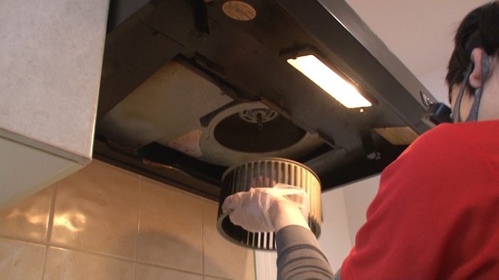 さらに、キッチンでは油べっとりのレンジフード、コンロ、壁といった箇所を見えないところまで丁寧にきれいにしていく濵田さん。新たな入居者が晴れやかな気持ちで新生活をスタートできるように、徹底的に汚れと戦います。