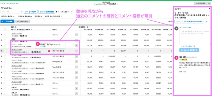 「DIGGLE」は、各予算項目に対して数値だけではわからない情報をコメントとして残すことで、予実管理にかかわる社内コミュニケーションを円滑化します。以前は各項目の詳細画面でコメント内容の閲覧・投稿を行っていましたが、画面遷移が多く発生していました。今回の機能拡充により、予算の一覧画面上で予算項目に対するコメントの投稿・閲覧ができるようになりました。数値データとコメント内容を照らし合わせながら、コメントの投稿・内容の確認が可能となり、予算策定や予算変更をよりスムーズに実現します。