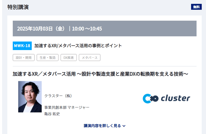国内最大級のメタバースプラットフォーム「cluster」を運営するクラスター株式会社(本社:東京都品川区、代表取締役CEO:加藤直人、以下「クラスター」)は、2025年10月1日(水)から10月3日(金)までインテックス大阪で開催される日本最大級の製造業向け展示会「ものづくりワールド」に出展いたします。