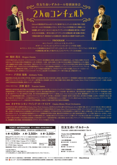 日本で最も長い歴史と伝統を誇る交響吹奏楽団の Osaka Shion Wind Orchestra を有する公益社団法人大阪市音楽団(本社:大阪市住之江区/理事長:石井徹哉)は、2025年5月6日(火・祝)に「住友生命いずみホール特別演奏会 2人のコンチェルト」を開催いたします。