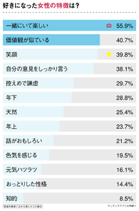 「今までにあなたが好きになった女性の特徴は?」と聞いたところ、1位は「一緒にいて楽しい(55.9%)」、2位は「価値観が似ている(40.7%)」でした。価値観や一緒にいて楽しいと感じるかどうかは個人と個人の相性が大きいといえます。気になるB型男子がいる女性は、3位に選ばれた「笑顔(39.8%)」を意識すれば、B型男子の心を掴めるかもしれません。