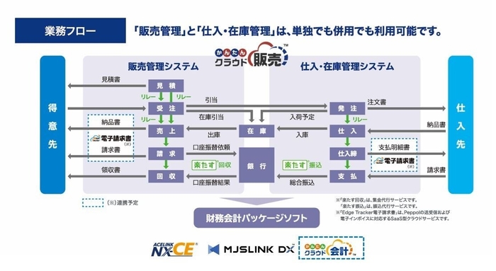 また、MJSが提供する財務・会計システムや、デジタルインボイスの送受信や適格請求書(インボイス)の電子化に対応するクラウドサービス『Edge Tracker(エッジ トラッカー) 電子請求書』とも連携し(※1)、販売管理と仕入・在庫管理にかかる業務をトータルでサポートします。