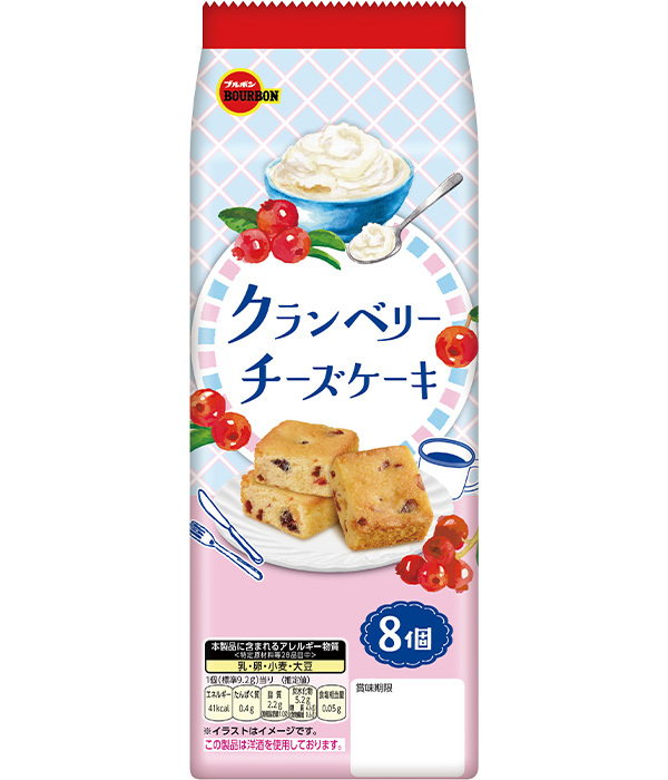 クランベリーをたっぷり加えて焼きあげたひとくちサイズのチーズケーキです。まろやかなチーズケーキにさわやかなクランベリーの酸味がアクセントになった商品です。