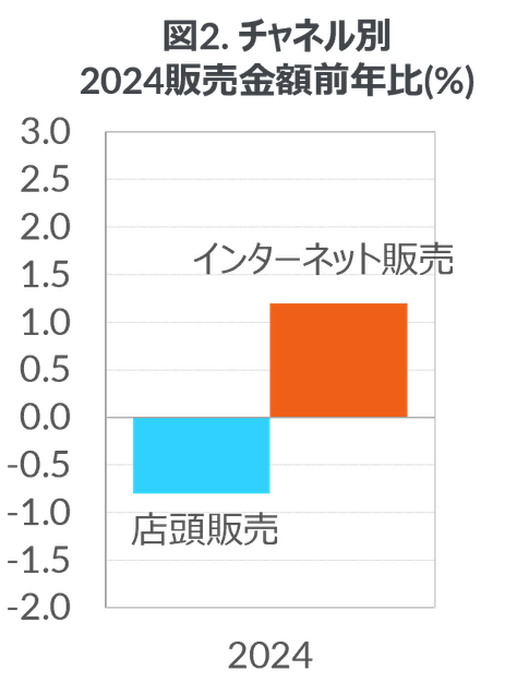 販売チャネル別で見ると、インターネットは金額前年比1%増となった(図2)。インターネットの成長は続いているが、2023年にその勢いが弱まり始め、2024年でさらに鈍化した。一方で店頭販売は金額前年比1%減と縮小する動きとなった。