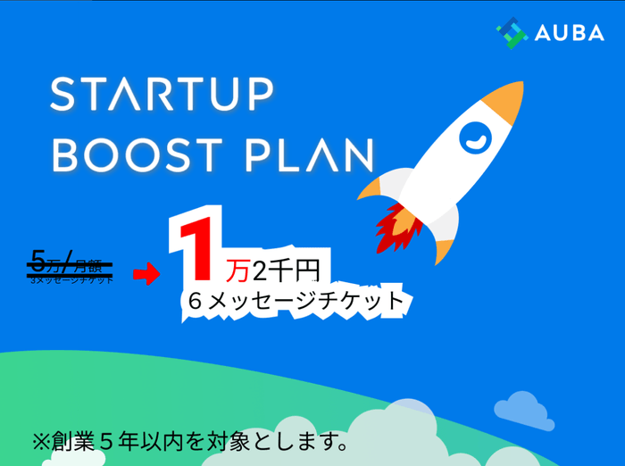 創業5年以内でAUBAをご利用の企業・団体様に、スタートアップブーストプランとして、メッセージチケットをお得にご提供いたします(通常3通5万円 → 6通1.2万円)。