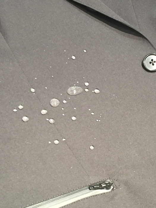 今回のスーツに使用している生地「MINOTECH®」は、古来の雨具として知られる「蓑(ミノ)」からアイデアを得て帝人フロンティア株式会社(大阪市北区)が開発した撥水生地です。この生地は、表面に付いた水滴が流れ落ちやすい独自の織り構造と加工により、高い撥水性を発揮します。また、優れた透湿性により汗の蒸れを軽減し、衣服内を快適な状態に保つほか、ストレッチ性も備えており着用時の窮屈感を緩和します。
