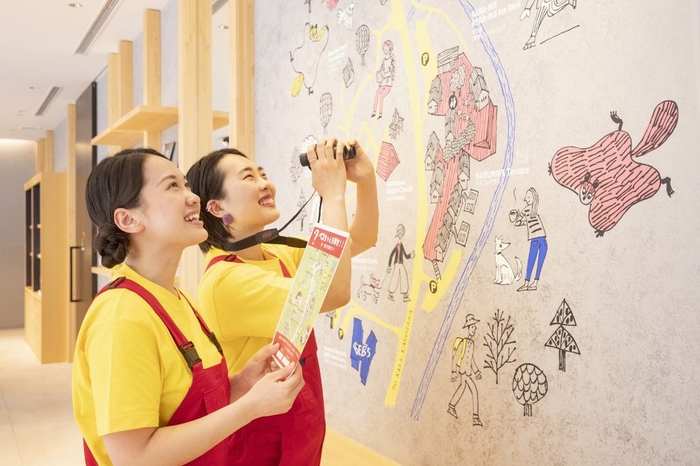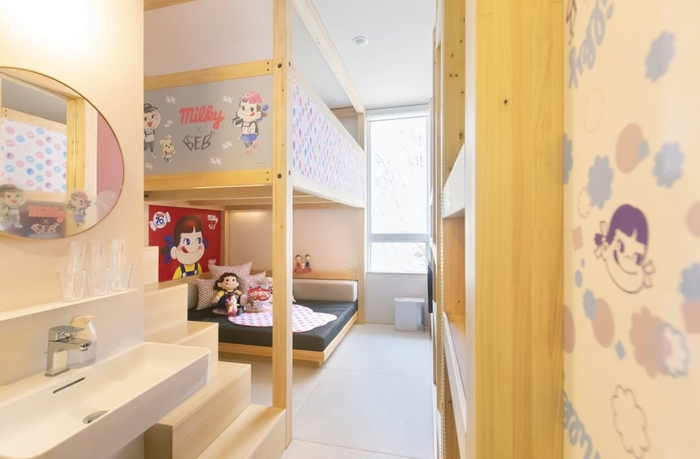 不二家のペコちゃんをイメージした、トップスとオーバーオールのセット「ペコちゃん仲良しコーデセット」を客室にご用意。日常では挑戦しづらいコーデも、仲間と一緒なら楽しめるはず! ペコちゃんになりきって、パブリックスペース「TAMARIBA(タマリバ)」でくつろいだり、周辺観光にお出かけしたり、記念撮影をしたり、楽しみ方は自分たち次第!