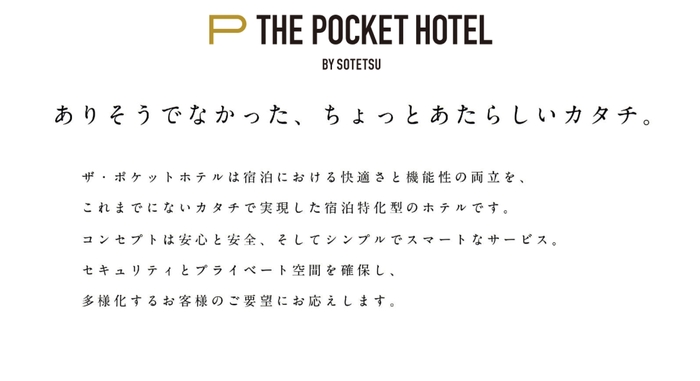 THE POCKET HOTELは、宿泊における快適さと機能性の両立をこれまでにない形で実現したホテルです。全室個室タイプで、セキュリティーとプライベート空間を高い水準で確保。セルフチェックイン・チェックアウト端末などのICT(情報通信技術)を活用した最先端の設備や4人部屋の設置などにより、多様化するお客さまの要望にお応えします。