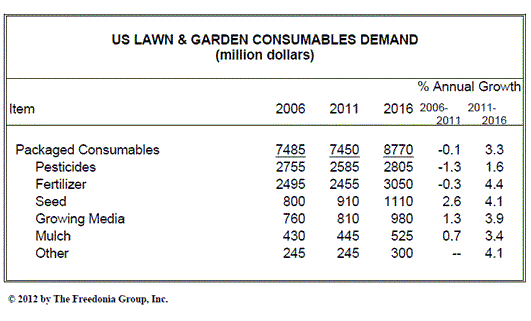 米国における芝・造園用消耗品の需要は、年平均3.3%で成長し2016年には88億米ドルの規模に達する見通しです。この成長は、住宅建設の回復によってもたらされる見込みです。