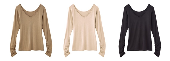 本商品は、フロントスタイルは深めのVネック、バックスタイルはラウンドネックのデザインで気分や合わせるアイテムによって前後2wayで着用できます。また、袖口はくしゅくしゅデザインであたたかくて、かわいらしい仕上がりにして います。素材はレーヨン95%のなめらかでほどよく身体にフィットする生地に保湿性の高いシアバター加工を施し、乾燥しがちな季節のお肌にやさしさもプラス。カラーは、みちょぱさんセレクトのロマンカーキーに加え、やわらかな印象のスイートベージュと合わせやすいブラックをラインアップしました。
