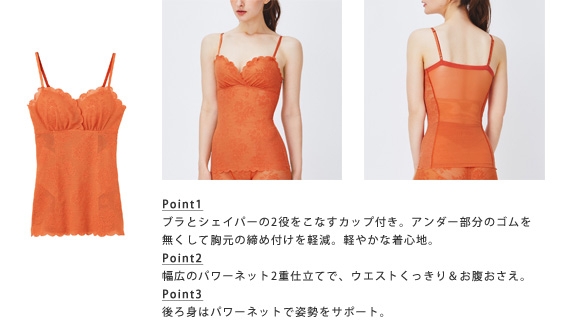 カップ付きキャミソールはウエスト部分のシェイプを強めに設計、ショーツとロングガードルもウエスト部分のパワー