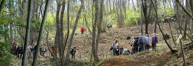 京王線長沼駅から徒歩5分のところにある長沼公園。ここの駐車場をスタートして上りが続く園路を抜け、頂上までの道のりを約1時間30分かけて散策します。途中、昆虫や植物を見つけて図鑑で調べてみたり、園路沿いの樹木を観察したり、日頃レンジャーが行っている保全活動やモニタリング調査を一緒に体験します。