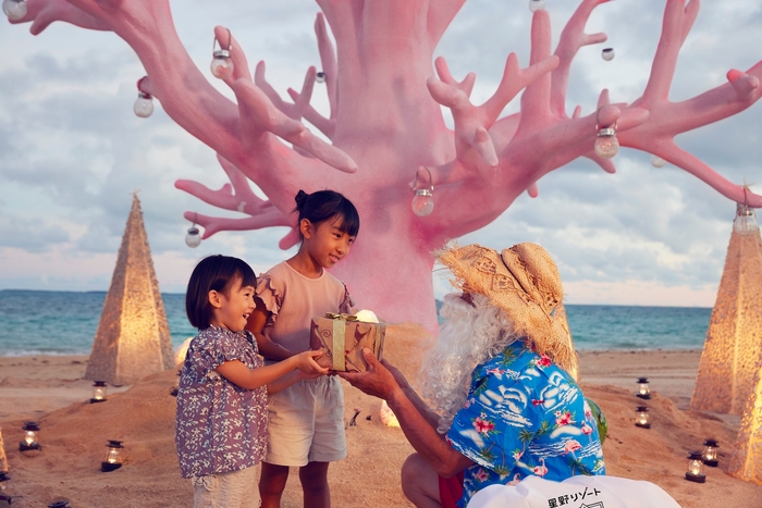 プライベート感のあるビーチに、今年はサンゴをモチーフにしたクリスマスツリーが登場します。サンゴに見立ててピンクに色づいたツリーの大きさは全長約6メートル。貝殻のライトや琉球ガラスの浮き玉を装飾し、ビーチクリスマスを演出します。また、周囲にはサンゴと白砂で作られたツリーも並び、夜になり点灯すると幻想的な雰囲気に包まれます。