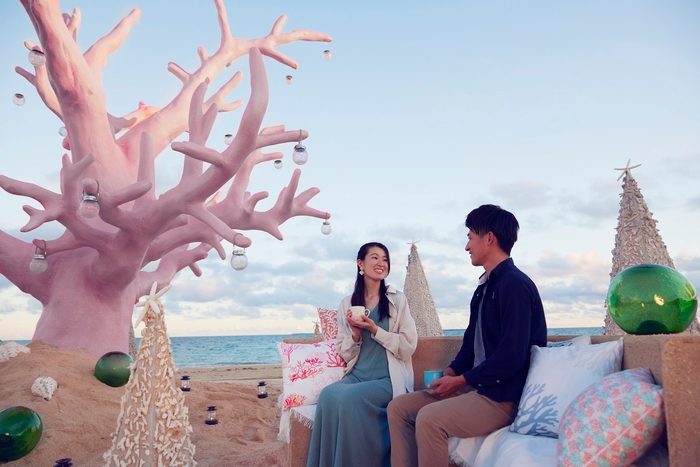クリスマスツリーの近くには、白砂で作られたソファを設置します。サンゴ柄のクッションなどで装飾したソファです。クリスマスツリーや満天の星を大切な人とゆったり眺めて過ごすことができます。また、ビーチでの時間を満喫できるよう「35COFFEE(サンゴコーヒー)」を提供します。風化したサンゴを200度まで熱し、サンゴ熱でじっくり焼き上げることにより、コーヒー本来のまろやかな味が楽しめる一杯です。