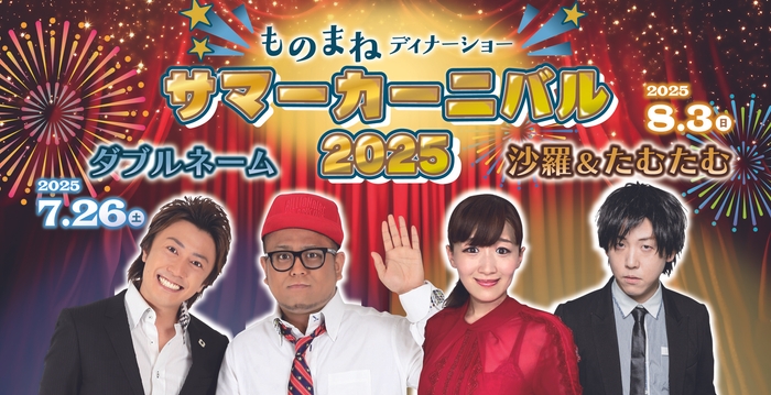 株式会社キャッスルホテル(本社:兵庫県明石市、社長:成田良伸)は、JR西明石駅近くのホテルキャッスルプラザにて、7月26日(土)と8月3日(日)の2日間、毎年恒例のサマーディナーショーを開催します。本年は、お笑いコンビ「ダブルネーム」とものまねタレント「沙羅&たむたむ」を特別ゲストに迎え、夏の夜を華やかに彩ります。チケットは6月18日(水)10:00からweb限定で予約受付を開始します。