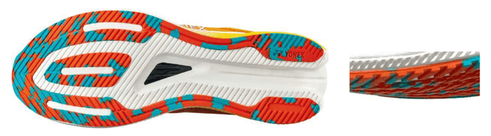 ソール全体には、スピード走行に最適化した新しいカーブ形状の「3Dパワーカーボン」を搭載。長距離走行時もペース維持に適した高剛性と転がりやすさを実現しています。また、ミッドソール素材「フェザーライト エックス」は、一般的なEVA材より約30%※4、軽量な素材であり、ソール部は厚みがありながらも女性用23.5cm は片足192g、男性用26.0cm で片足220g という軽さを実現しています。さらに、シーソーのように半自動で前傾を促進するロッカー形状や、高耐久・高グリップの「エンデュランスラバー」、結び目がほどける要因となる紐のばたつきを防ぐ伸縮性の「エラスティックバンド」を新機能として採用しています。