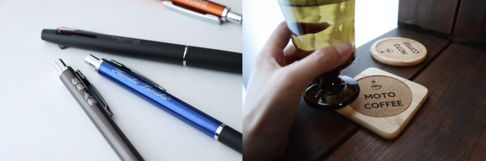 お気に入りの文房具やお店で使うアイテムにお名前やロゴを入れることができます。お好きな数とお好きなデザインで、1個からオーダー可能です。