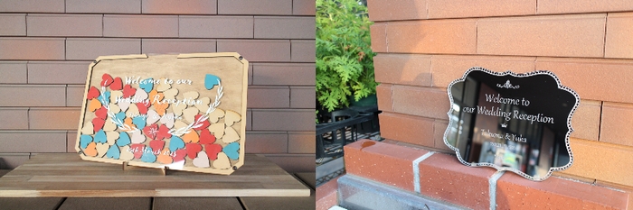 ご希望のサイズにカットし、アクリル板にはレーザーカッターで文字入れをします。ハート型の切り抜きはお好きな色でペイント。ウェルカムボードをデジタルとおもてなしの心で作り上げました。