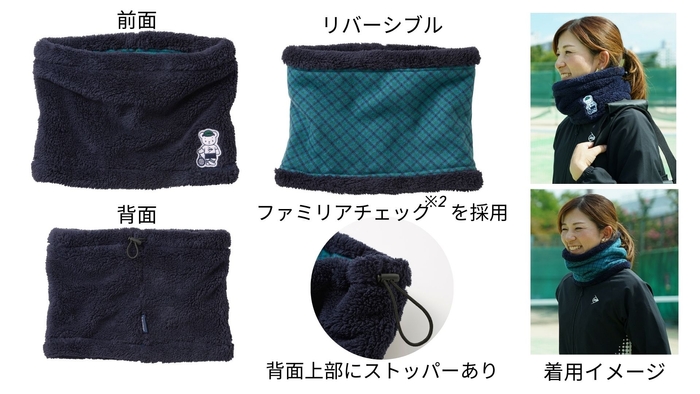ボアとファミリアチェック※2のリバーシブルデザインを採用し、「ファミちゃん」のワッペンが可愛らしいネックウォーマー。寒い日のスポーツシーンでも暖かく、快適に動けます。その日の気分によって、使い分けができることもリバーシブルの魅力です。