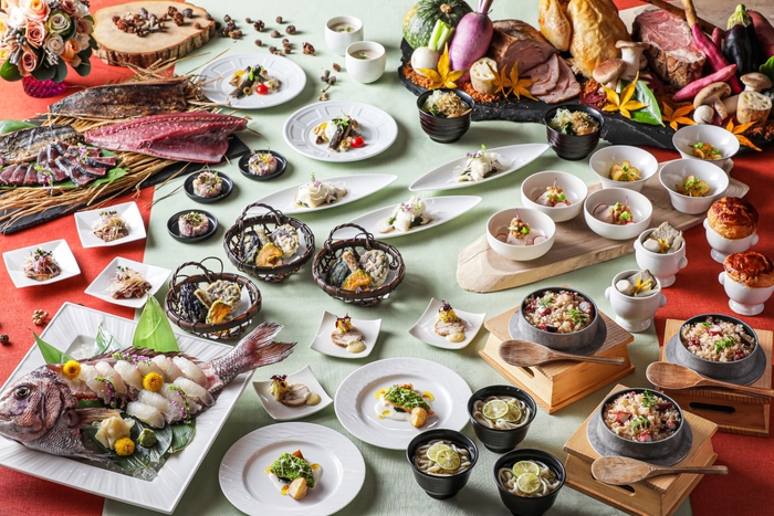 一年の中で最も食材が満ち溢れた季節“秋”の秋の味覚を一堂に集めた「まるごと秋の味覚!ストリングス収穫祭フェア」を開催いたします。「シェフズ ライブ キッチン」では「四国地方」をテーマに海の幸カツオ、愛媛の鯛、カンパチの藁焼きや、タコめし、じゃこ天などの郷土料理がブッフェ台に並びます。