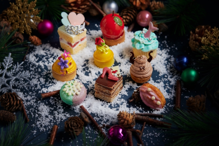 白雪姫のリンゴムース/プリンセスシンデレラの苺ショートケーキ/プリンセスベルのレモンタルト/ドレスアップビーストモンブラン/スノープリンセスのマロンカシスマカロン/人魚姫のカップケーキ/パステルマーメードの真珠マドレーヌ/ハートの女王のヘーゼルナッツのオペラ/フラワープリンセスのかぼちゃタルト