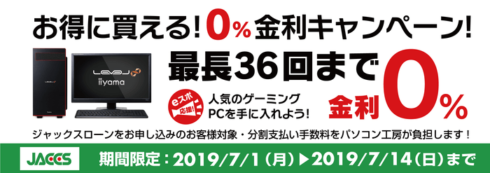 パソコン工房・グッドウィルを運営する株式会社ユニットコム(代表取締役:端田 泰三、本社:大阪市浪速区)は、パソコン工房Webサイトおよび全国のパソコン工房・グッドウィル各店舗にて、ジャックスローンをご利用の場合、分割支払い金利手数料が最長36回まで無料になる『ショッピングローン0%金利キャンペーン』を2019年7月1日(月)より開始しました。