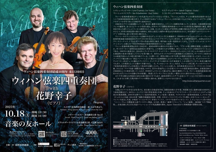 本年(2025年)、結成40周年の節目の年を迎えており、「プラハの春・国際音楽祭」に出演のほか、多くのヨーロッパ諸国の記念演奏会に登場する。この楽団の大きな特徴は、何といってもメンバーが固定されていることである。1985年に結成され、2014年にヴィオラのヤクブ・チェピツキー、2018年にチェロのミハル・カニュカの両氏がそれぞれ創設時の奏者の後釜としてバトンを受け継いだ。40年ものキャリアの中で人事異動はこれ2回のみ、ヴァイオリン奏者の2人は結成当初からその座を張り続けている。この驚くべき一貫性が彼らに対する多くの賛辞の対象となっており、ニューヨーク・タイムズ紙は彼らの「固定メンバーによって築かれた信頼関係によるアンサンブル」に注目している。ヴィオラのヤクブ・チェピツキー氏はチェコの優れたヴァイオリン、そしてヴィオラの両方をこなす演奏家で、しかも第1ヴァイオリン奏者の御子息でもあり、この楽団にとっても極めて幸運である。一方、チェロのミハル・カニュカ氏は、ウィハンと同じ国、チェコのプラジャーク弦楽四重奏団のチェロ奏者として約40年活躍したのち、ウィハンに入団した。室内楽奏者のみならず、ソリストとしての活動、さらには「プラハの春・国際音楽祭」の中で、若手の登竜門としての音楽コンクールの常任委員長を務め、音楽祭自体の芸術委員としての重責を担っているなど、世界的チェリストとして揺るぎない地位を獲得している。