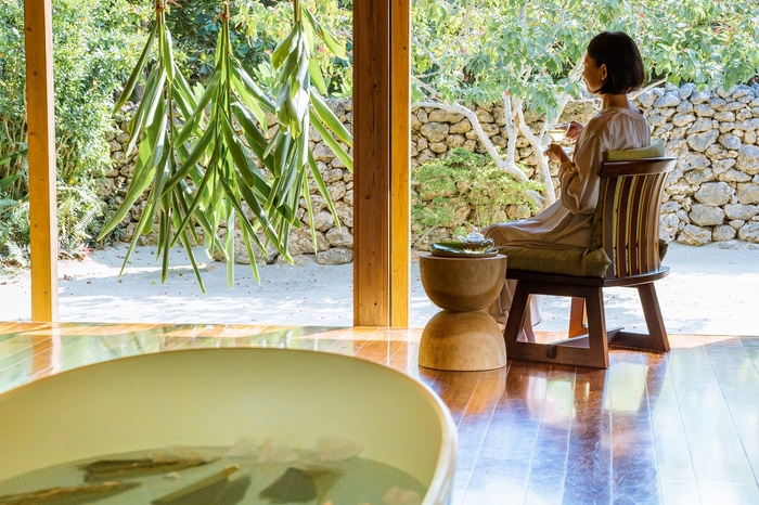 時計がない客室で目覚ましをかけず、自然の目覚めで起き上がった後、空腹を感じたときに連絡をすることで、好きなときに客室で朝食が食べられます。空腹を感じたときに食べ、時間に縛られないことで、忙しく時間に追われる日常から自分自身を解放します。心身のバランスを取るには、身体の声に耳を傾け、心の動きを感じることが大切です。滞在2日目の朝食は月桃茶漬け定食を提供します。月桃で蒸した魚や、春が旬の食材を取り入れた小鉢料理とごはんを合わせ、月桃茶を注ぎます。熱々の月桃茶をかけることで芳しい香りが立ち、自然と食欲がそそられる朝食です。月桃茶にはピーヤシやレモングラスといったハーブや、シークヮーサーなどをお好みでブレンドでき、その日の体調や気分で香りを楽しめます。滞在3日目の朝食は、パンと具材を自由に組み合わせるサンドウィッチです。パンは命草(ぬちぐさ)*2パンやベーグルなど。具材は月桃の香りをまとった鶏ハムや、青パパイヤ、島人参、海老などの島で親しまれている食材から好みのものを自由に選びます。普段は慌ただしい朝の時間から解放され、空腹時に身体に取り込む朝食の美味しさを感じながらゆっくり過ごすことで、心と身体が自然と調います。
