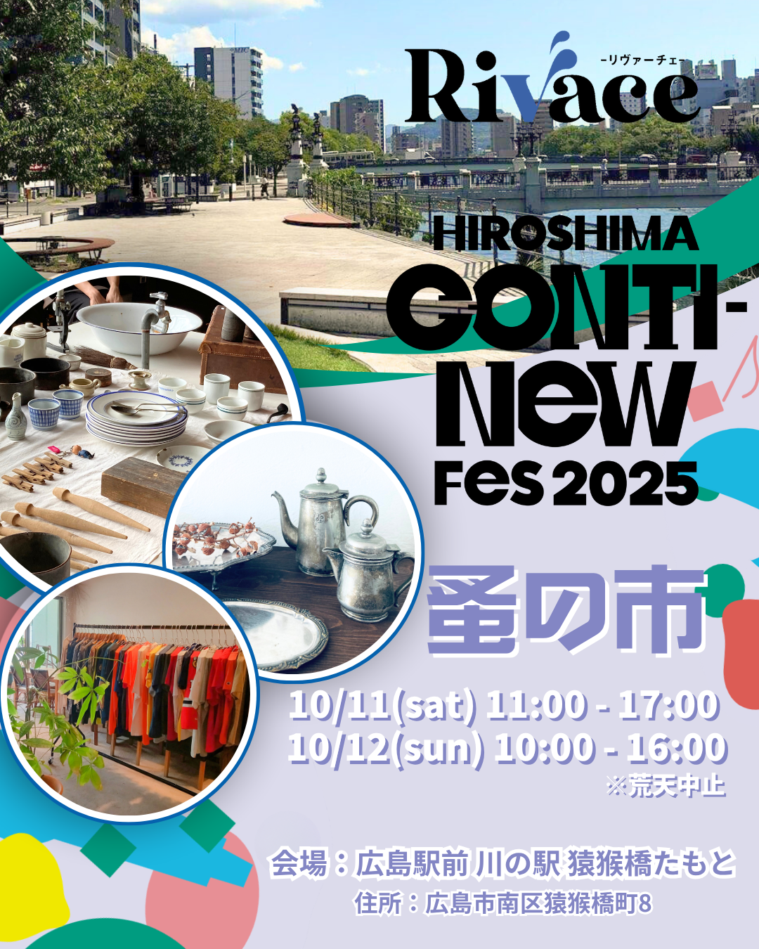2025年10月11日(土)から13日(月・祝)にかけて、広島を舞台に開催する「HIROSHIMA CONTI-NeW FeS 2025(ヒロシマ コンティニュー フェス 2025)」。音楽やカンファレンス、グルメに加えて、広島駅前の川沿い「川の駅」では、アンティークやヴィンテージなど掘り出し物満載な【蚤の市】を11日(土)・12日(日)の二日間開催します♪
