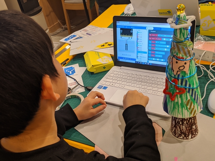 フォトインタラプターやサーボモーターの使用を学びながら、牛乳パックや色紙を使用して各人の独創的な工作をプログラミングにより動かし、発表会を行いました。