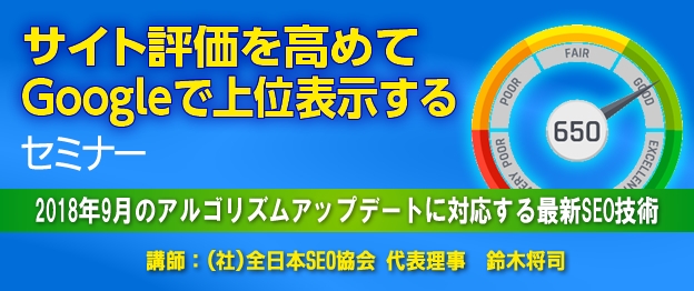 一般社団法人全日本SEO協会(本部:東京都港区、代表理事:鈴木 将司)は、検索で“上位表示する方法”を分かりやすく解説する『サイト評価を高めてGoogleで上位表示する』セミナーを、2018年11月20日(火)に東京国際フォーラム、11月9日(金)に大阪梅田、11月2日(金)に愛知県産業労働センター ウインクあいち、11月16日(金)に福岡県中小企業振興センターで開催いたします。