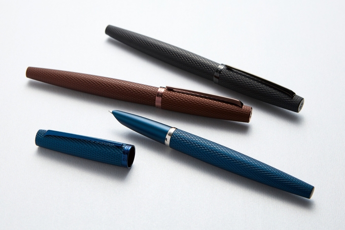 VIPER(バイパー)は、ギロシェパターンの彫刻だけでなく、アノダイズ加工のメタリックな風合いの仕上げとも好相性となっており、流線型のフォルムはボディ、グリップ、そして精緻に設計され滑らかな書き味を発揮するフーデッドニブへと一体感のある曲線を描きます。従来使用していた14金ペン先(エクセレンスA2、アエロなど)をステンレスにすることで価格を抑え、初めての万年筆としても最適なアイテム。機械で代えることの出来ない熟練による手作業で作り上げられたVIPERは、ブラウンの登場により、ブラウン/ブルー/ブラックの3色から自分のスタイルに合わせて選択できるようになります。