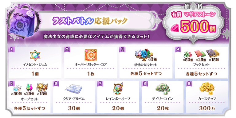 「ラストバトル応援パック」には、メインストーリー第2部12章「結ぶ永久の彩り」中編で展開される最終決戦において役立つ、魔法少女の育成素材やメモリアの強化素材などが封入されており、有償マギアストーンと無償マギアストーンのそれぞれで購入できるパックが4種類あります。