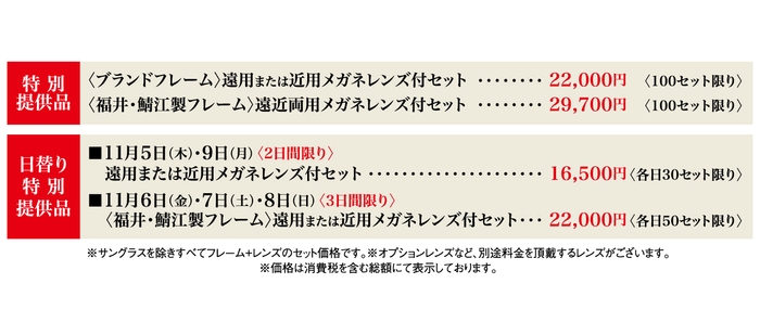 有名ブランドや福井・鯖江製フレーム+レンズセットを16,500円からご用意しております。期間限定のお買得なセットは、数に限りがございますのでお早目のご来店がおすすめです。