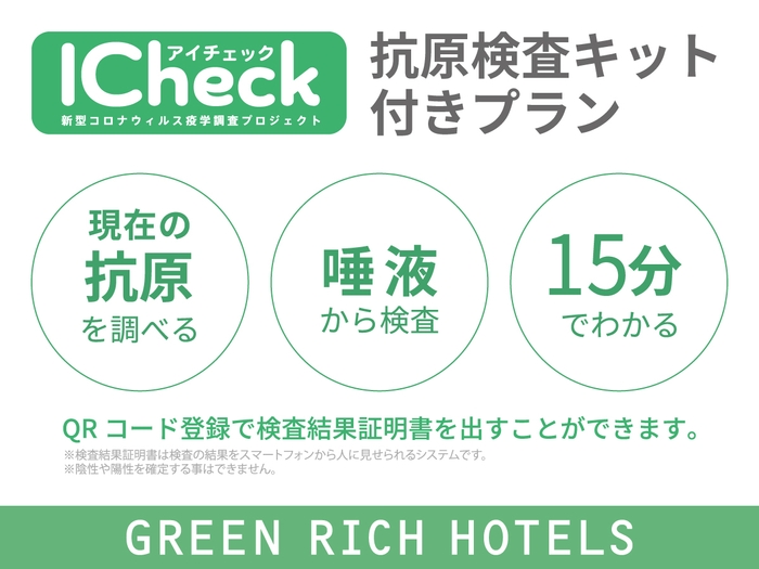 株式会社グリーンホテル・ズ コーポレーション(本社:福岡県久留米市 代表取締役社長:岡村隆裕)は、お客様の不安を少しでも解消し、安心してお過ごしいただけるよう、社会貢献の一環として、感染状況が15分で検査可能な抗原検査キット「ICheck(アイチェック)」を全施設にて順次販売を開始いたします。