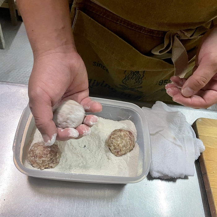 粗挽きと細引きをブレンドした挽肉を手捏ねしたミートボールは肉肉しい荒々しさとしっとり感を両立しています。