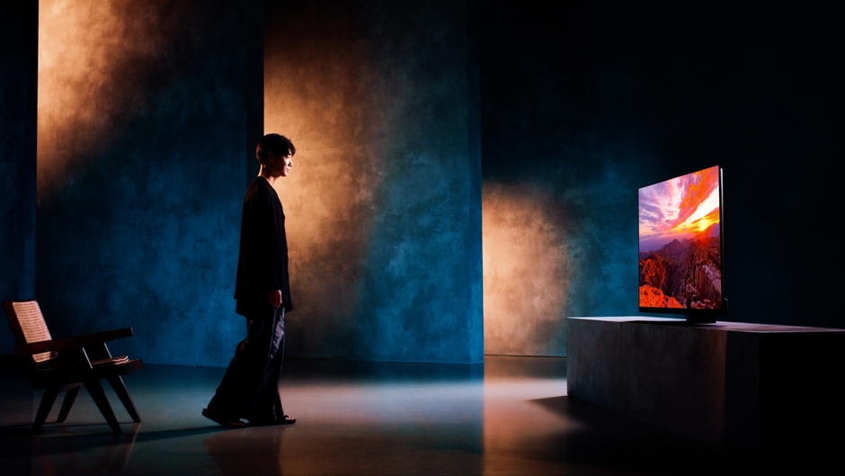 真剣な表情でテレビを見つめる綾野剛さん。圧倒的な映像美によって、嗅覚、味覚、触覚など、視覚以外のあらゆる感覚が刺激されていくような、新たな視聴体験を体感します。