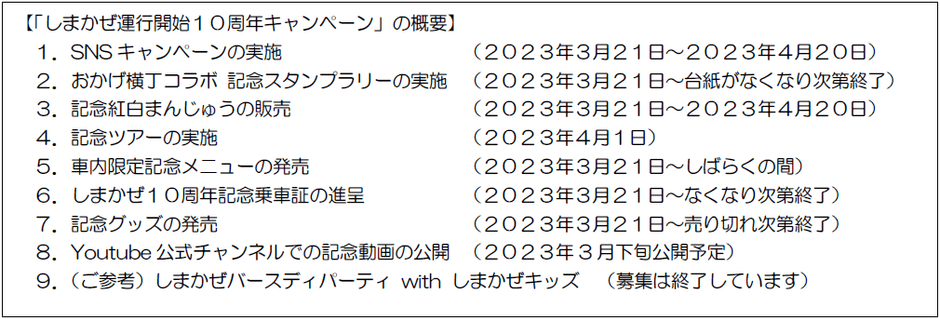 しまかぜ10周年キャンペーンの詳細は別紙のとおりです。