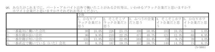 Q6は、これまで勤めた会社がいわゆるホワイト企業かブラック企業かを5段階で聞いた。「一番最初に働いた会社」では選択中央値が2.79となっており、日本全体ではややブラック企業寄りに傾倒していることが窺える。それでも「ふつうの企業だと思う」が過半数、「一番直近で働いている(いた)会社」で「かなりホワイト企業だと思う」「そこそこホワイト企業だと思う」が20.4%であるので、意外と捨てたものではないかも知れない。但し年齢が高くなるほど、特に50歳以上で「かなりブラック企業だと思う」「そこそこブラック企業だと思う」の選択が減ることから、この世代がいかに恵まれた就労環境であったかが分かるだろう。
